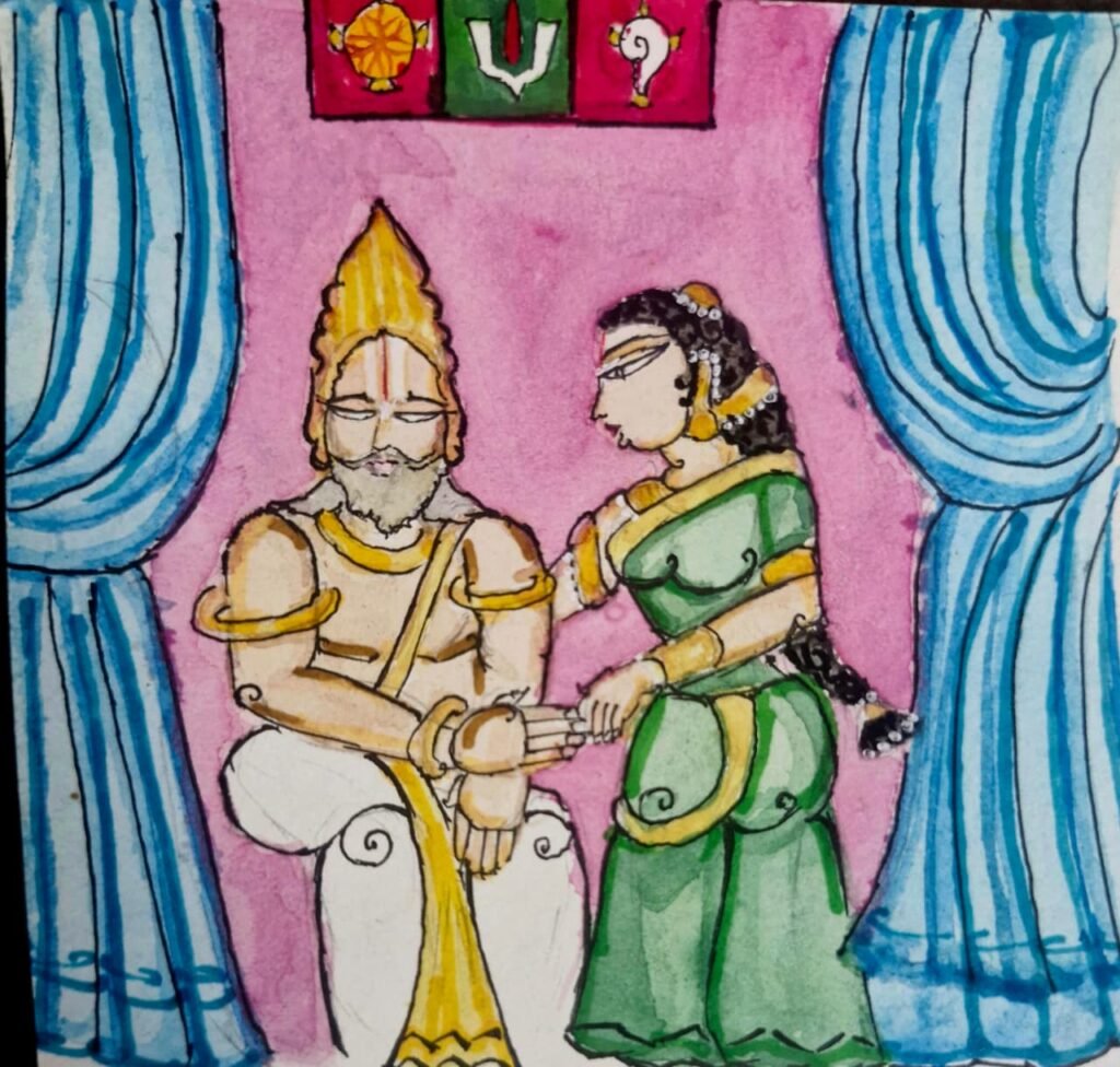 As king dhaSaratha cried and called out kausalyAp pirAtti’s name in a feeble voice, kausalyAp pirAtti comes forward and holds king dhaSaratha’s frail body and asks in fear “What would you like me to do?”.