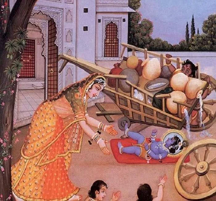 ಒಮ್ಮೆ ತಾಯಿ ಯಶೋದೆಯಯು ಎತ್ತಿನ ಗಾಡಿಯ ಚಕ್ರದ ಅಡಿಯಲ್ಲಿ, ತೊಟ್ಟಿಲು ಕಟ್ಟಿ ಶ್ರೀಕೃಷ್ಣನನ್ನು ಅಲ್ಲಿ ಮಲಗಿಸಿ ತನ್ನ ಕೆಲಸದಲ್ಲಿ ಮಗ್ನಳಾದಳು. ಆ ಸಮಯದಲ್ಲಿ, ಕಂಸನಿಂದ ಕಳುಹಿಸಲ್ಪಟ್ಟ ರಾಕ್ಷಸನು ಕೃಷ್ಣನನ್ನು ಕೊಲ್ಲಲು ಸುಲಭವಾದ ಮಾರ್ಗವನ್ನು ಕುರಿತು ಯೋಚಿಸುತ್ತಿದ್ದನು ಮತ್ತು ಗಾಡಿಯ ಚಕ್ರವನ್ನು ಪ್ರವೇಶಿಸಿದನು. ಅವನು ಶ್ರೀಕೃಷ್ಣನನ್ನು ಕೊಲ್ಲುವ ಉದ್ದೇಶದಿಂದ ಅವನ ಕಡೆಗೆ ತಿರುಗಲು ಪ್ರಾರಂಭಿಸಿದನು. ಅದೇ ಕ್ಷಣದಲ್ಲಿ, ಕೃಷ್ಣನು ಎಚ್ಚರಗೊಂಡು, ತನ್ನ ದಿವ್ಯ ಪಾದಗಳನ್ನು ಗಾಳಿಯಲ್ಲಿ ಒದೆಯುತ್ತಾ ತಾಯಿಯ ಹಾಲಿಗಾಗಿ ಅಳಲು ಪ್ರಾರಂಭಿಸಿದನು. ಆ ಶಕತಾಸುರನು ಎಂಪೆರುಮಾನಿನ ದಿವ್ಯ ಪಾದಗಳ ಸಮೀಪಕ್ಕೆ ಬಂದು ದಿವ್ಯ ಪಾದಗಳಿಂದ ಒದೆಯಲ್ಪಟ್ಟನು. ಅವನು ತಕ್ಷಣವೇ ದುರ್ಬಲನಾದನು, ತುಂಡುಗಳಾಗಿ ಮುರಿದು ನೆಲದ ಮೇಲೆ ಬಿದ್ದನು. ಬಂಡಿಯೂ ಕೂಡ ತಕ್ಷಣ ಕಳಚಿ ಬಿದ್ದಿತು. ಇದನ್ನು ನೋಡಿದ ತಾಯಿ ಯಶೋದೆ ಕೃಷ್ಣನ ಬಳಿಗೆ ಓಡಿ ಬಂದು ಅವನನ್ನು ಎತ್ತಿಕೊಂಡು ಅಎತ್ತಿಕೊಂಡಳು. ಕೃಷ್ಣನು ಭಗವಂತನ ಕೃಪೆಯಿಂದ ಮಾತ್ರ ರಕ್ಷಿಸಲ್ಪಟ್ಟನು ಎಂದು ಅಲ್ಲಿದ್ದವರೆಲ್ಲರೂ ಭಾವಿಸಿದ್ದರು.