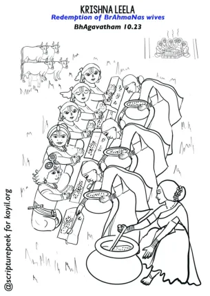 ಆಗ ಕೃಷ್ಣನು ಅವರೊಡನೆ, “ನಮಗೆ ಈಗ ಆಹಾರ ಎಲ್ಲಿಂದ ಸಿಗುತ್ತದೆ? ನಾವು ನಮ್ಮ ಮನೆಗಳಿಂದ ಬಹಳ ದೂರದಲ್ಲಿದ್ದೇವೆ. ಸರಿ, ಇಲ್ಲಿ ಕೆಲವರು ಋಷಿಗಳು ಆಶ್ರಮಗಳನ್ನು ನಿರ್ಮಿಸಿಕೊಂಡು ಭಗವಂತನನ್ನು ಕುರಿತು ತಪಸ್ಸು ಮಾಡುತ್ತಿದ್ದಾರೆ. ನೀವು ಅವರ ಬಳಿಗೆ ಹೋಗಿ ಆಹಾರವನ್ನು ಕೇಳಿರಿ. ನಾವೆಲ್ಲರೂ ಅದನ್ನು ಹಂಚಿಕೊಂಡು ಊಟ ಮಾಡೋಣ” ಎಂದು ಹೇಳಿದನು.