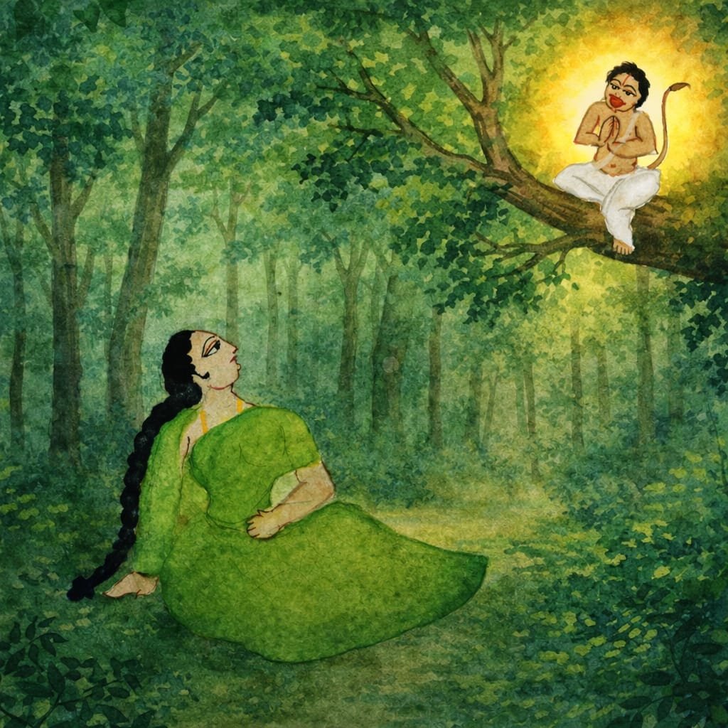 Since sIthAp pirAtti had been constantly meditating on SrI rAma, hearing of unexpected occurrences might shock her and cause her to lose her life. Therefore thiruvadi – a scholar in ‘aindhra vyAkaraNam’ (aindhra, an old school of grammar), carefully reasoned within himself. He then, decided to speak to her in a way that would gradually alleviate her pain.