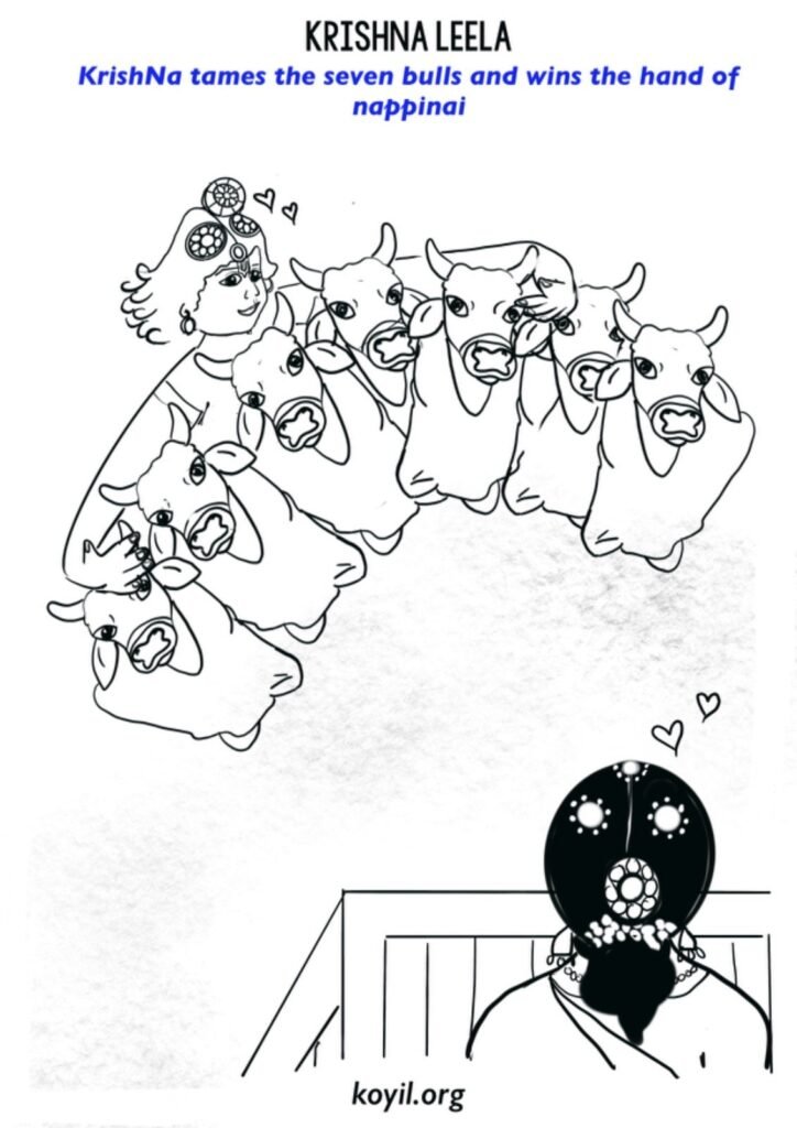 నప్పిన్నై పిరాట్టి తండ్రి ఆమెకు వివాహం చేయాలని నిర్ణయించాడు. ఆమెను పొందడానికి ఏడు శక్తివంతమైన ఎద్దులు వశం చేయాలని నియమం పెట్టాడు. నమ్మాళ్వార్ చెప్పినట్లుగా, కృష్ణావతారం రావడం యొక్క రెండు ప్రధాన కారణాల్లో ఒకటి —నప్పిన్నై పిరాట్టి ఆలింగనం కోసం. కృష్ణుడు ఆ ఏడు ఎద్దులను ఒకేసారి మెడల దగ్గర పట్టుకుని అణిచివేసి హతమార్చాడు. అందుకు నప్పిన్నై పిరాట్టి సంతోషంగా కృష్ణుణ్ణి వరించింది.